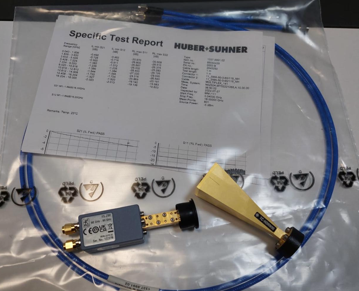 Our measurement setup is supported by high-frequency accessories optimized for automotive radar systems. These include a 60–90 GHz horn antenna, low-loss matched cables, and a harmonic mixer that enables high-frequency signal conversion, all compatible with our Rohde & Schwarz oscilloscope.